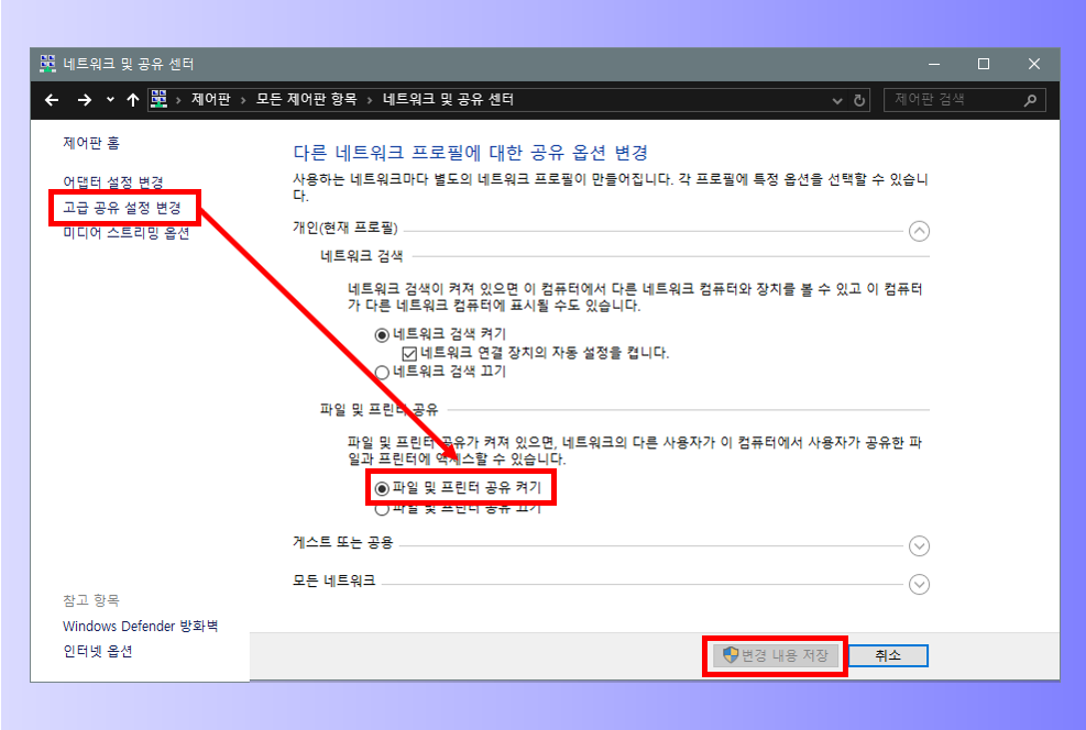 3. 고급 공유 설정 변경: 왼쪽 메뉴에서 "고급 공유 설정 변경"을 클릭합니다.