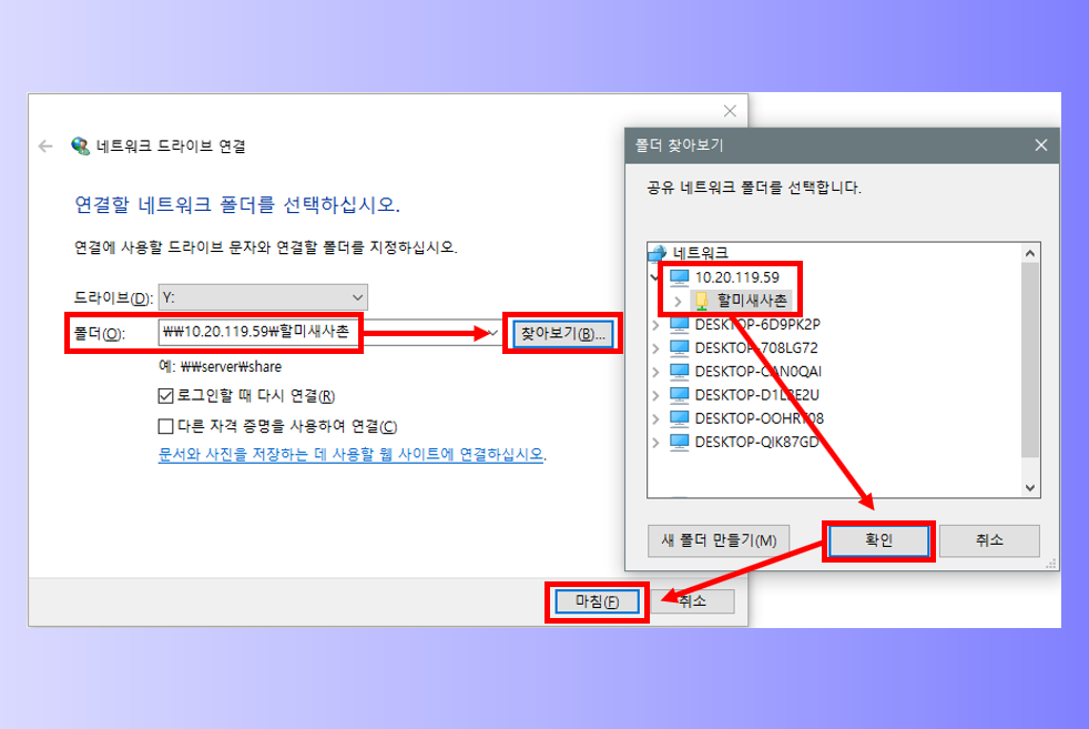 2. 폴더 경로 입력: 폴더 주소에 \\컴퓨터이름\공유폴더이름을 입력하고, 연결을 설정합니다.